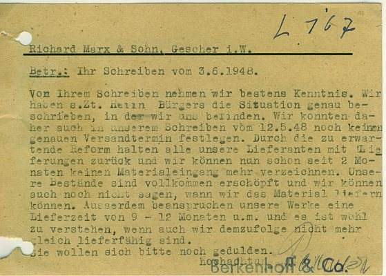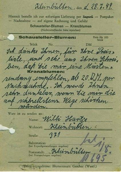 Aber die Menschen brauchen, besonders in schweren Zeiten, die Begegnung auf Volksfestplätzen. Diese Feste spielen im bäuerlichen aber auch im städtischen Festkalender eine große Rolle. Der Wunsch nach diesem traditionellen "miteinander feiern" wurde immer stärker und auch die Schausteller wollten endlich ihrem Gewerbe wieder nachgehen. Nicht nur um Geld zu verdienen sondern auch um sich und den Menschen Freude zu bereiten. Es wurde dafür gekämpft, die traditionellen Feste wieder feiern zu können. Ab 1948 durften wieder die ersten Kirmessen abgehalten werden. Für die Firma Richard Marx & Sohn war, wie in ganz Deutschland zu dieser Zeit, die Rohmaterialbeschaffung ein großes Problem. Wegen des Geschäftzweiges der Kranzblumenherstellung war die Blumenproduktion nie ganz eingestellt worden. Somit konnten die Schausteller im Münsterland auf den ersten Jahrmärkten nach dem Krieg mit Papierblumen der Firma Richard Marx & Sohn beliefert werden.