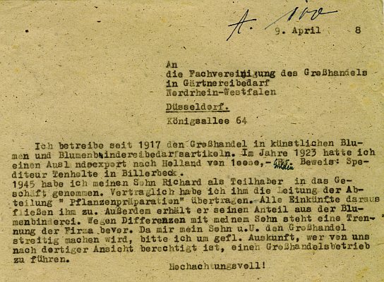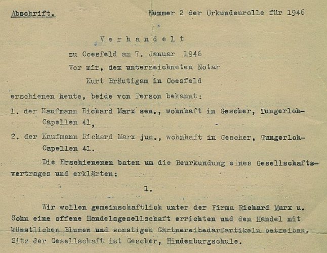Mitte der 50er Jahre besaß die Firma schon 2 Autos. Eines das Bernhard Marx gemeinsam mit einer Hilfskraft fuhr und ein weiters mit dem mit sich Elisabeth Marx mit einem Verkaufsfahrer auf Verkaufstour begab. Das Verkaufsgebiet der Artikel für Schaustellerbedarf wurde ausgedehnt, die Konkurrenz war groß. Um sich von den Mitbewerbern abzuheben, war es unabdingbar, sowohl ein gutes Sortiment zu haben, zuverlässig und preiswürdig zu sein, als auch die sogenannten oft knappen "Saison-Knüller" in ausreichender Menge auf Lager zu haben. Die Fabrikation von Papierblumen war eingestellt worden. Es waren gute und günstige Lieferanten für die Kunstblumen gefunden worden. Der Trend ging eindeutig zu Plastikblumen, die nur zu geringen Teilen in Deutschland produziert wurden. Aus der ehemaligen Blumenfabrik in Gescher war ein Groß- und Einzelhandel geworden.