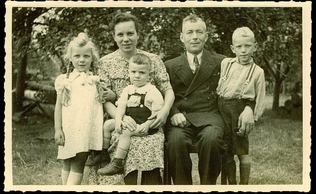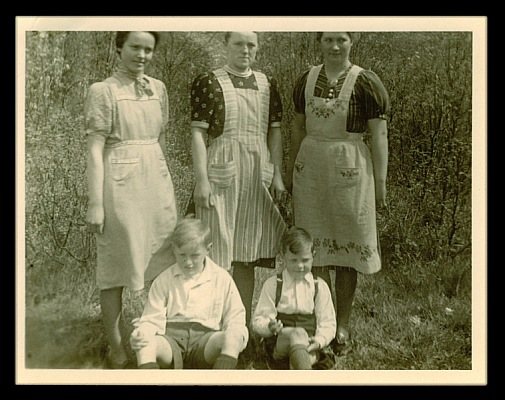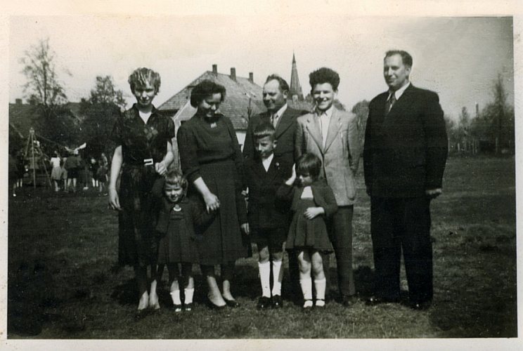 Auguste Brüggenbrock, Ulla Marx, Elisabeth Marx, Reinhold Marx dahinter Franz Schulte gen. Steggert, Gerhild Marx, dahinter Norbert Schulte, Bernhard Marx