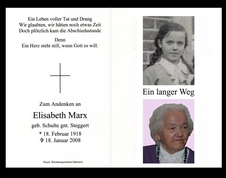 Elisabeth Marx geborene Schulte genannt Steggert wurde auf einem typischen münsterländer Einsiedler Bauernhof geboren und verbrachte dort ihre Jugend. Ihr Vater war 2-mal verheiratet und sie hatte insgesamt 19 Geschwister. Der Stammbaum lässt sich bis zum Jahre 1762 zurückverfolgen. Er wurde 1981 unter der Federführung von Ursula Gescher geb. Schulte (Tochter von Heinrich Schulte) erstellt.