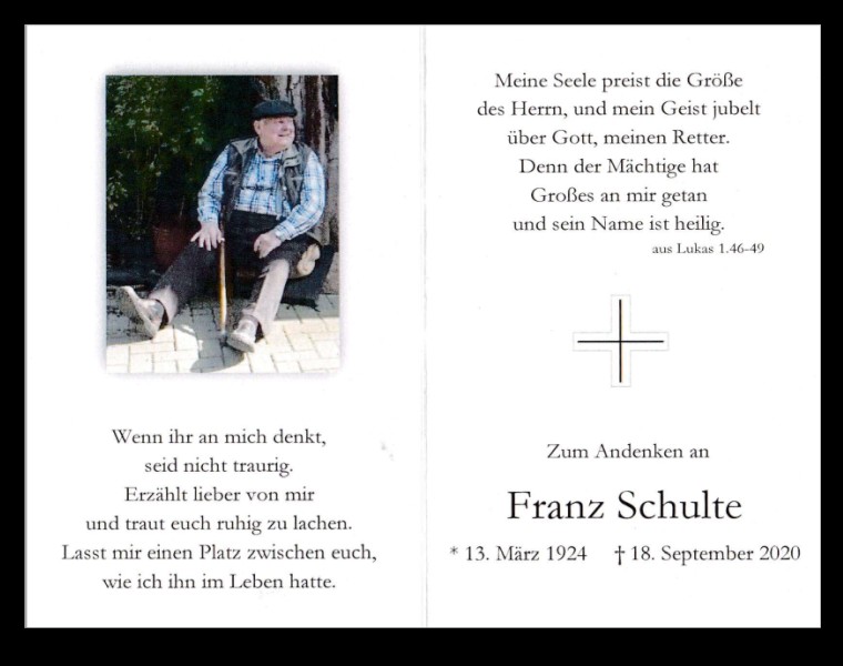 Franz Schulte ist der jüngste Bruder von Elisabeth Marx geb. Schulte gen. Steggert. Er hat in den frühen 50er Jahren als Mitarbeiter bei der Firma Richard Marx & Sohn gearbeitet und zeitweise auf der August-Wessing-Str. 20 in Gescher gewohnt. Auch seine spätere Frau August genannt Guste Brüggenbrock war zu der Zeit als Hausangestellte bei der Familie Marx tätig.